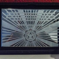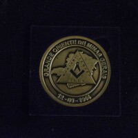 Moeda comemorativa ao Biocentário da Maçonaria Universal. Grande Loja soberana de Baixa Califórnia - México, moeda criada em comemoração aos duzdentos anos de maçonaria no Estado do México. Presente dado ao Grande Oriente de Minas Gerais em ocasião da visita da comitiva GLSBC as dependências do GOMG no ano de 2006.